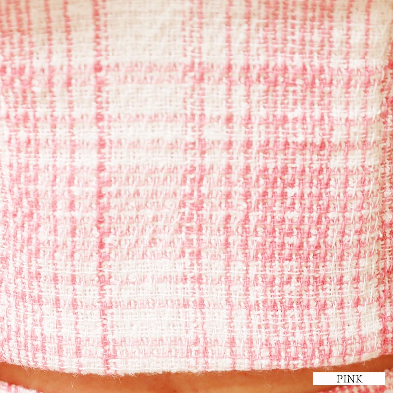 大胆なチェック柄に付属のパールストラップが乙女心くすぐるポイントに。